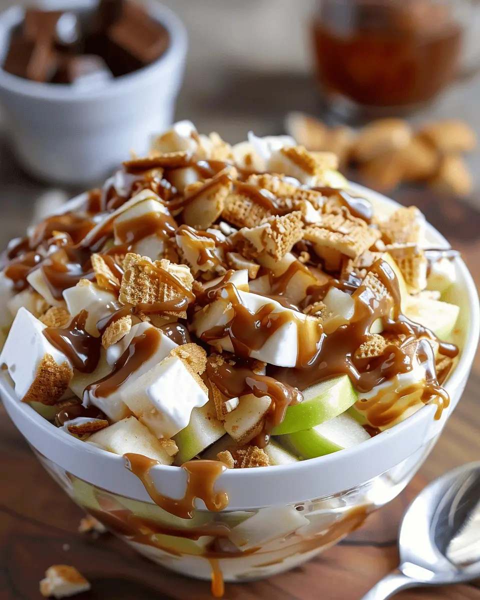 What makes this dish unique is its variety of textures. The crisp apples provide a refreshing crunch, while the Snickers add a chewy, nougat-filled delight. When mixed with a fluffy, whipped topping and rich caramel, each bite is a symphony of flavors that meld beautifully together.