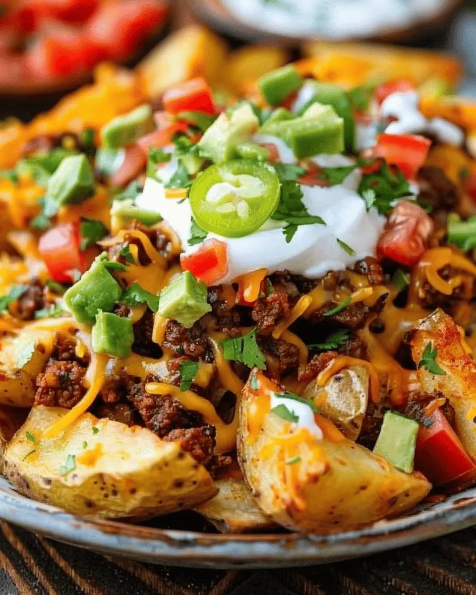 Whether you’re sharing them with friends or treating yourself, these cheesy taco potatoes are sure to impress. Happy cooking!
