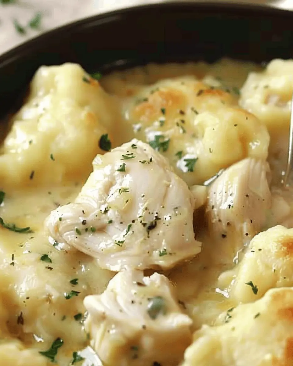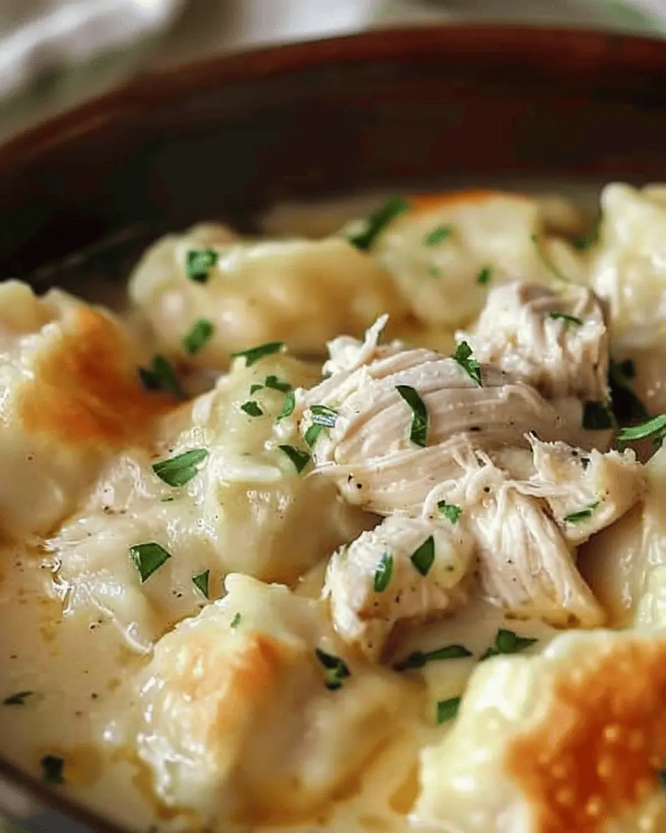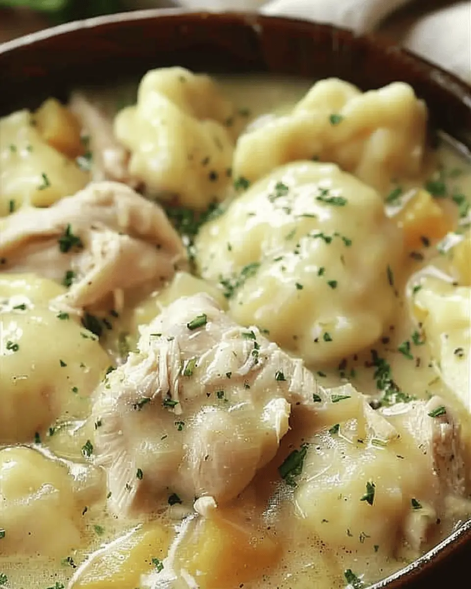 Enjoy a warm and comforting bowl of Chicken and Dumplings, perfect for family dinners.