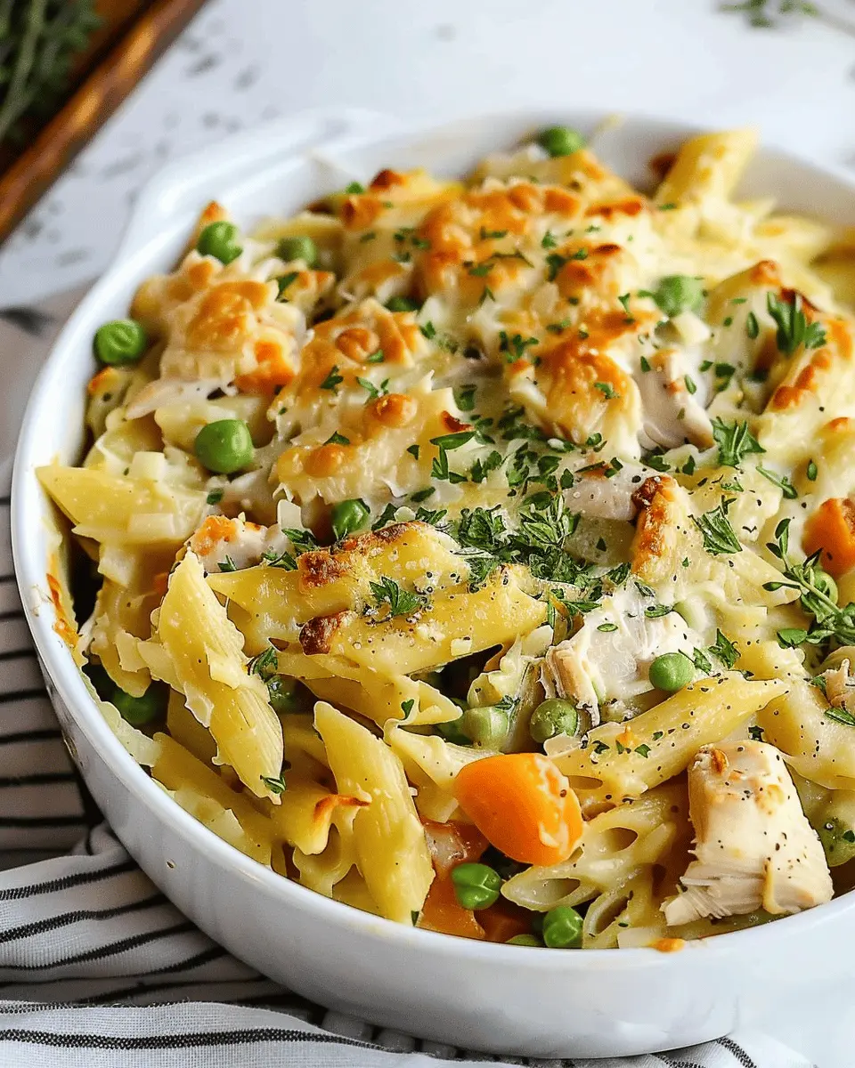 Experience the rich flavors of a classic chicken pot pie in pasta form. This recipe combines tender chicken, hearty vegetables, and a creamy sauce over pasta for a comforting meal.