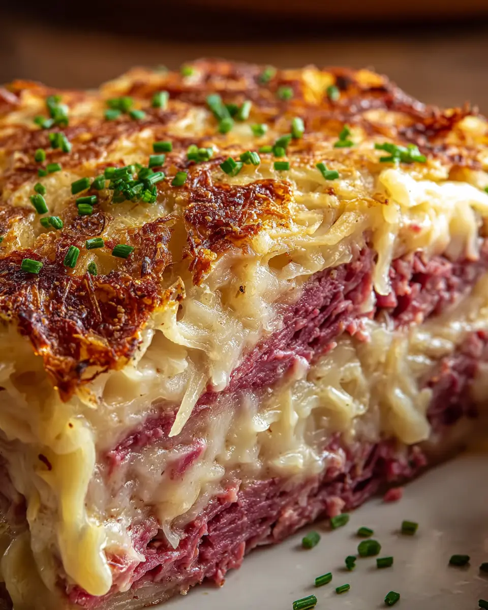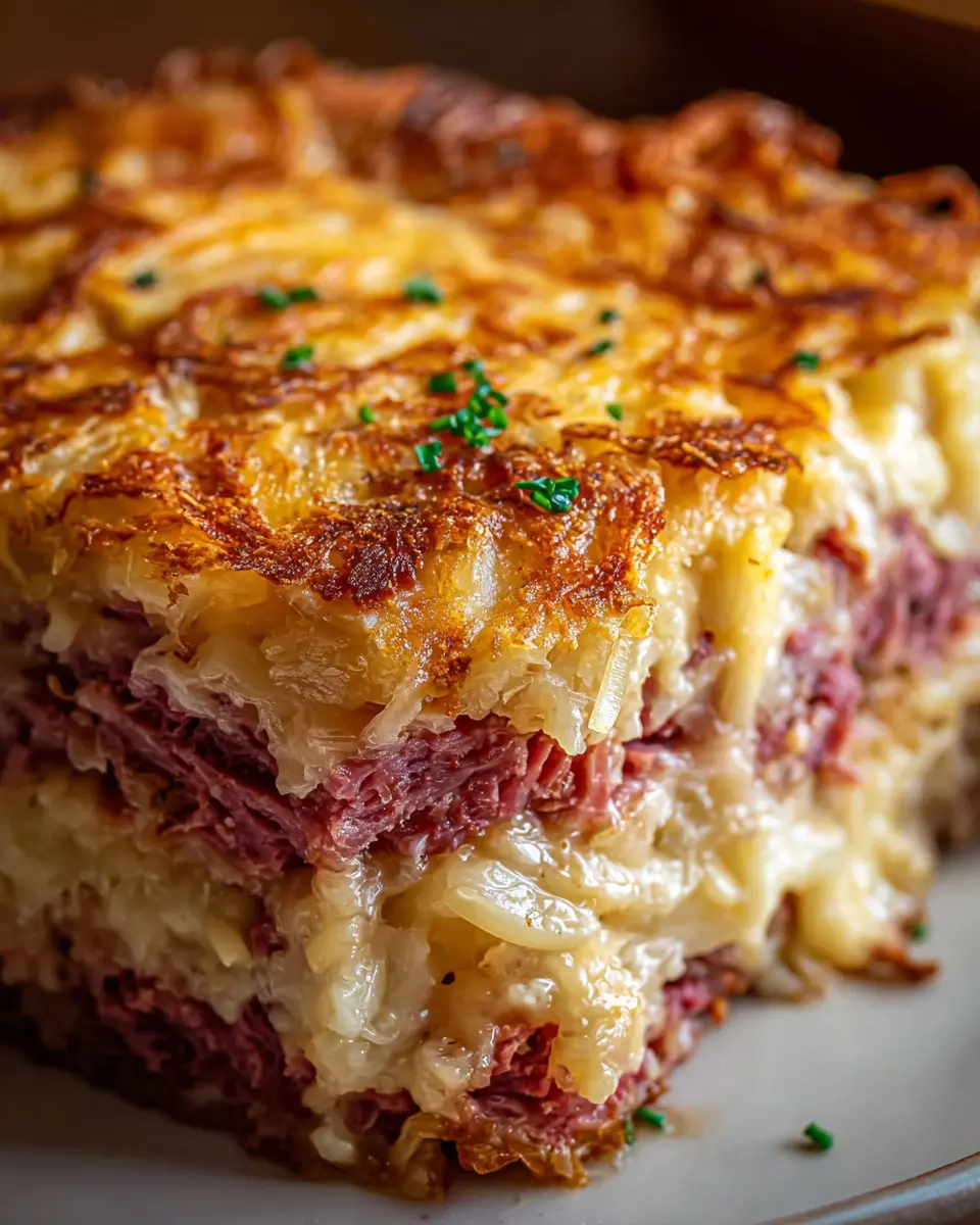 A hearty, delicious dish that brings the classic flavors of a Reuben sandwich to a comforting bake.