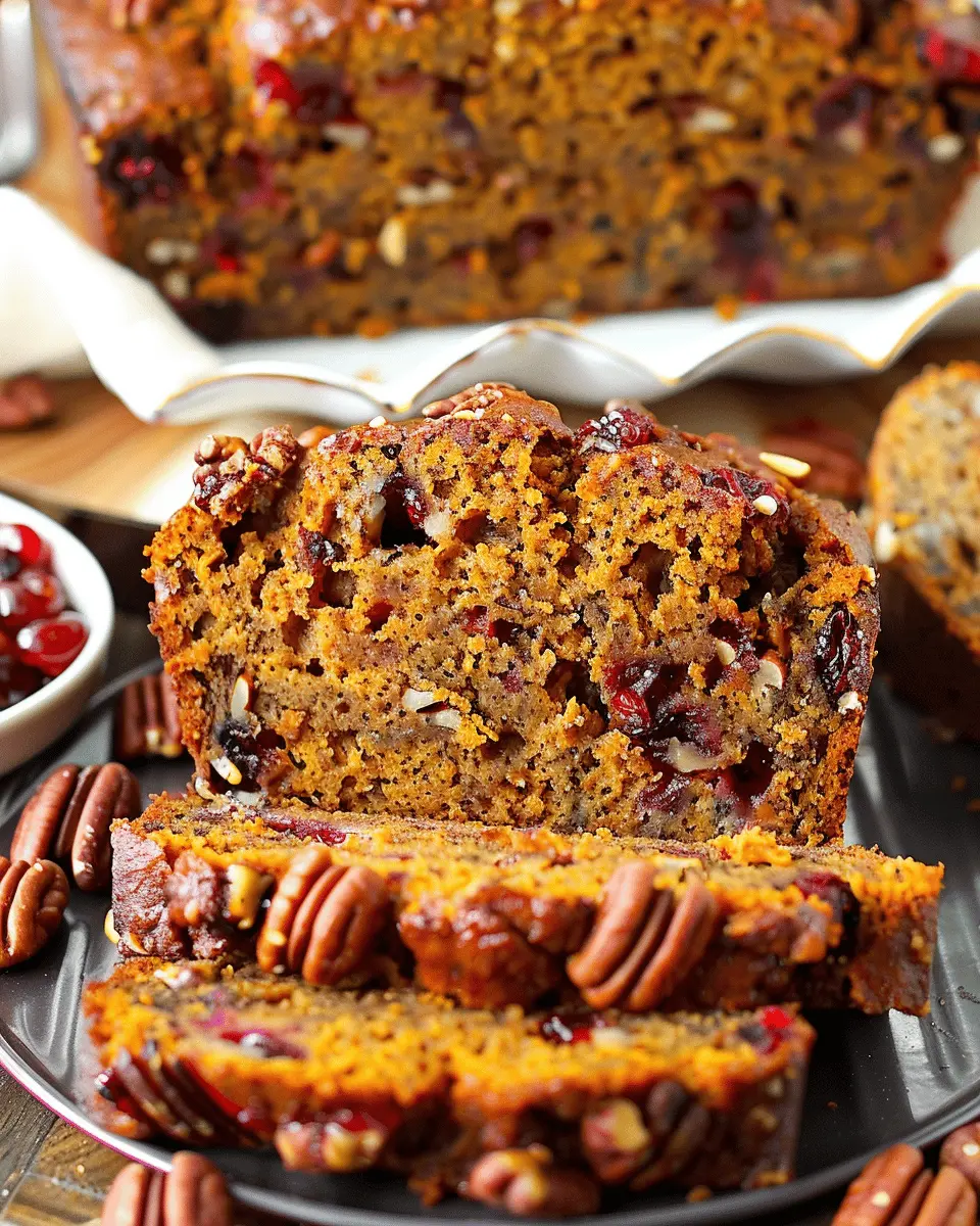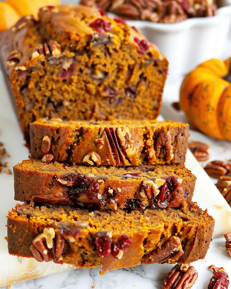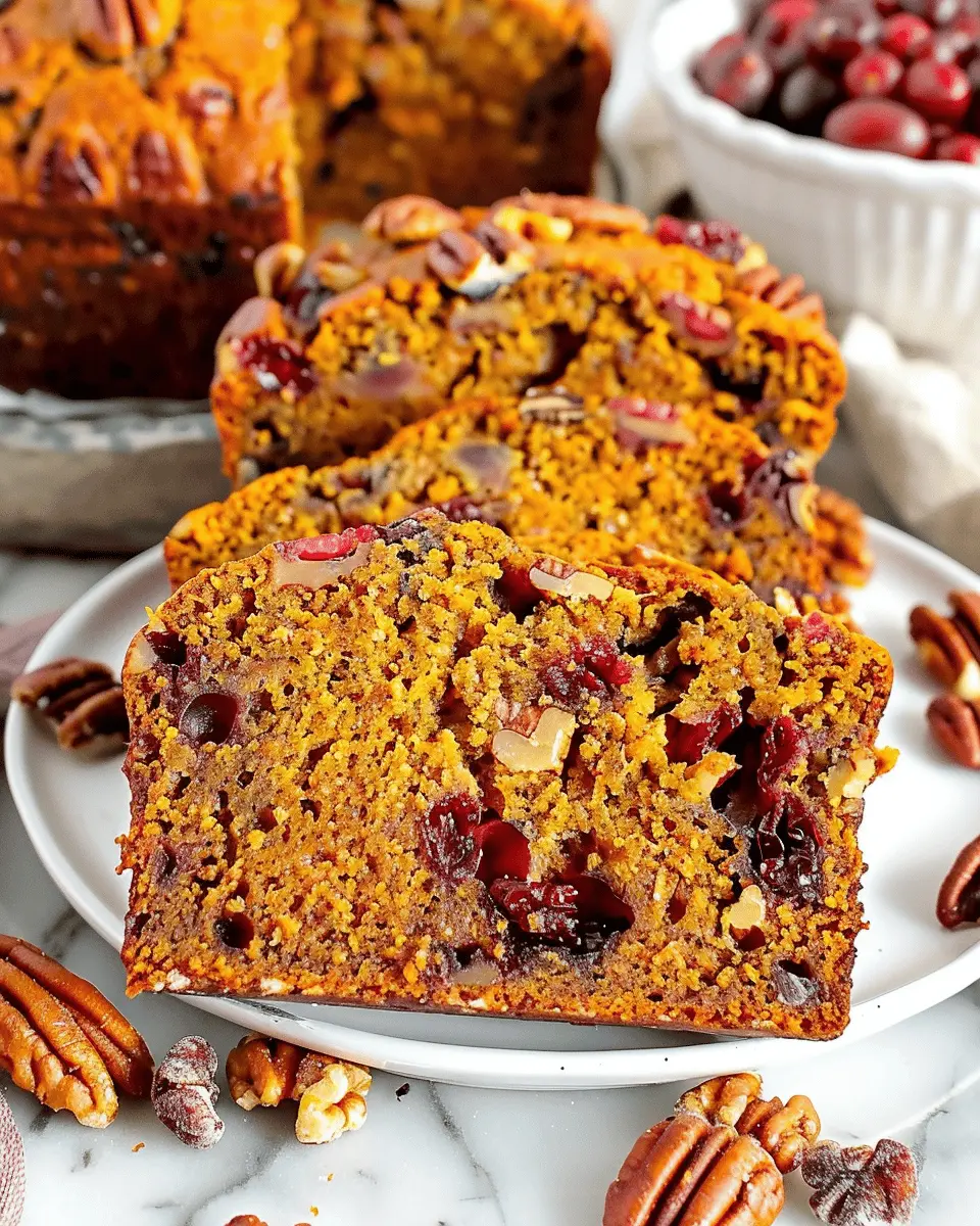 Delight in the moist and flavorful experience of Cranberry Pecan Pumpkin Bread, perfect for any occasion.