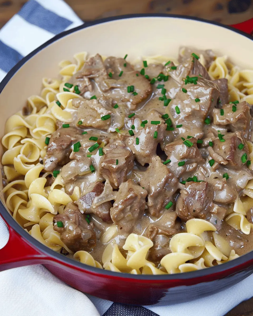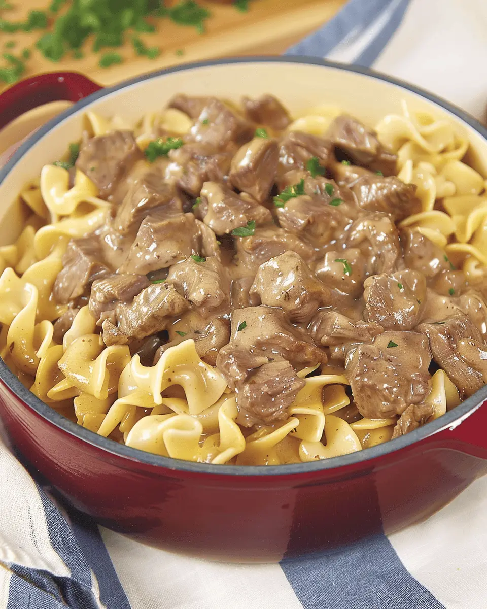 A rich and creamy dish featuring tender beef served over egg noodles, perfect for a cozy dinner at home.