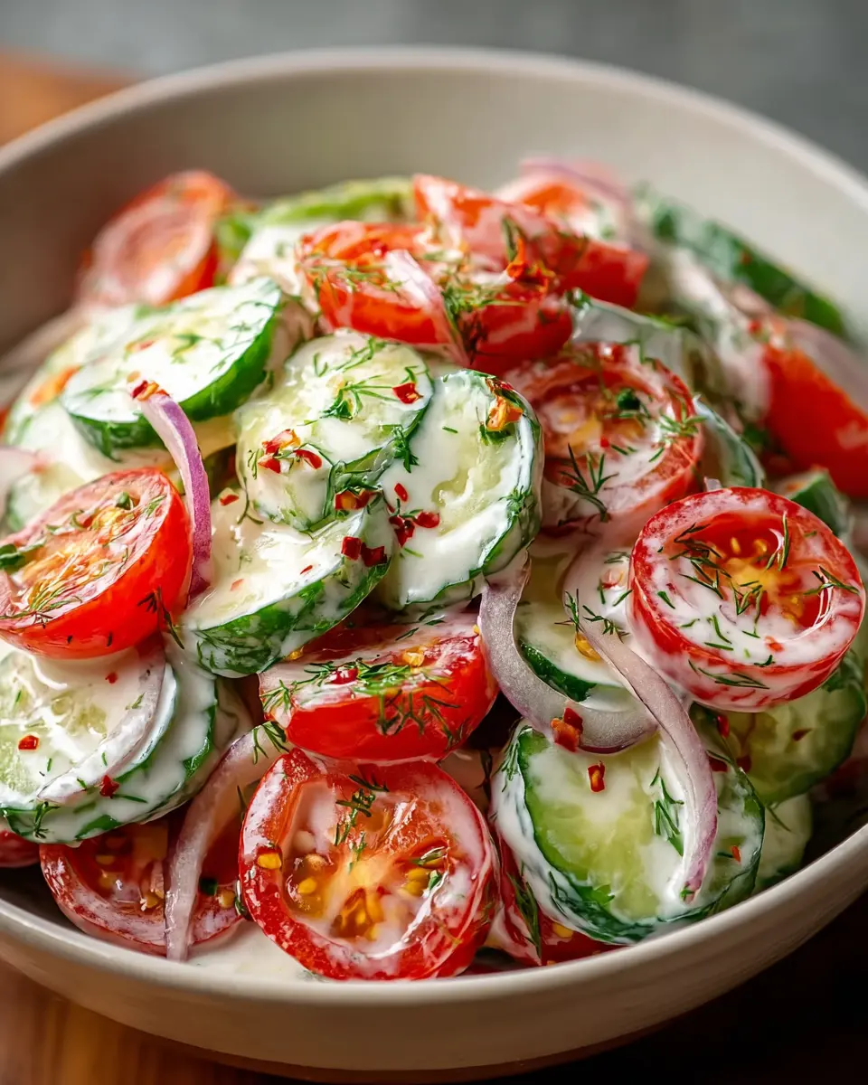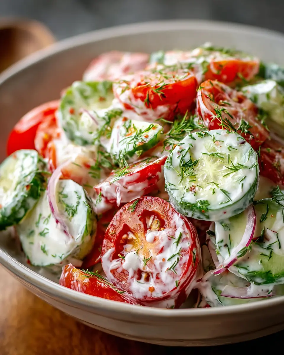 Finally, it’s time for the grand reveal! When you’re ready to serve, give the salad one last gentle toss. You can garnish it with a few sprigs of fresh herbs or some sliced olives for an extra touch of elegance. Serve your Creamy Cucumber Tomato Salad in a beautiful bowl, and watch as your friends and family dive in!
