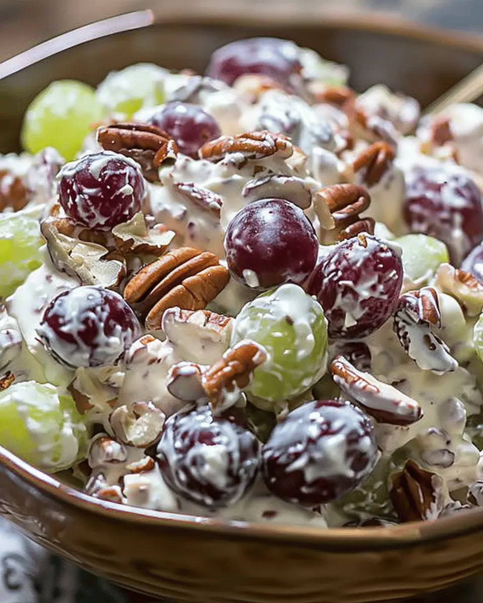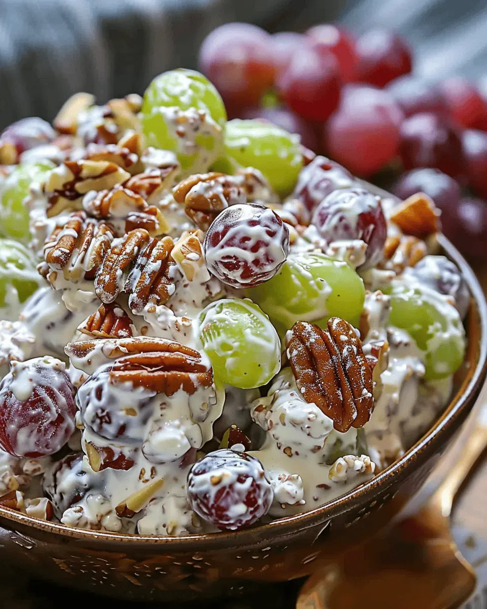 A delightful and refreshing creamy grape salad with a crunchy texture from pecans, perfect for any occasion.
