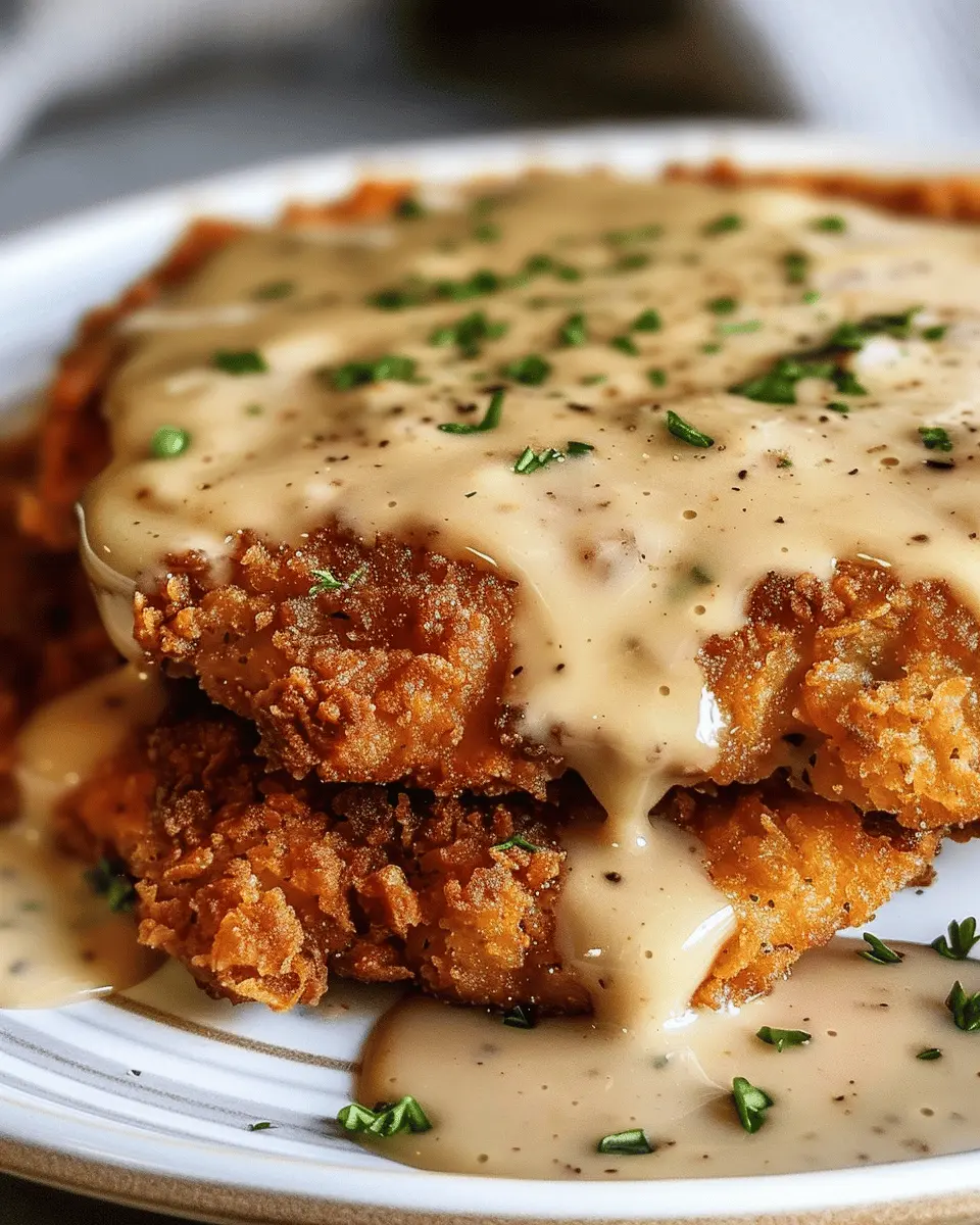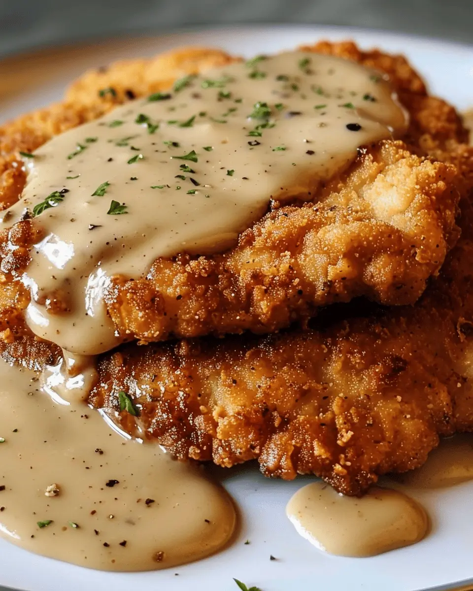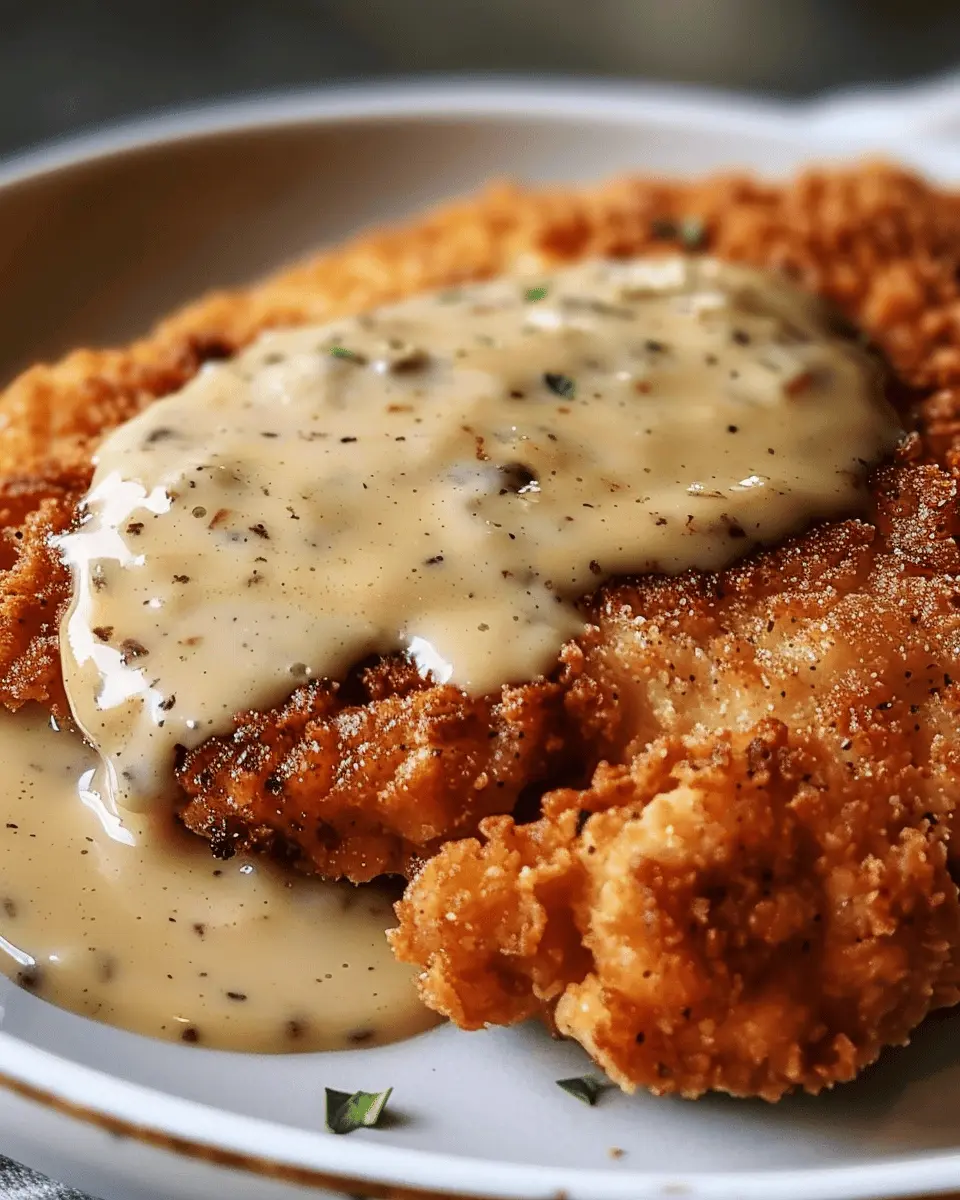 A mouthwatering crispy buttermilk chicken fried steak topped with creamy country gravy. Perfect for a hearty meal.