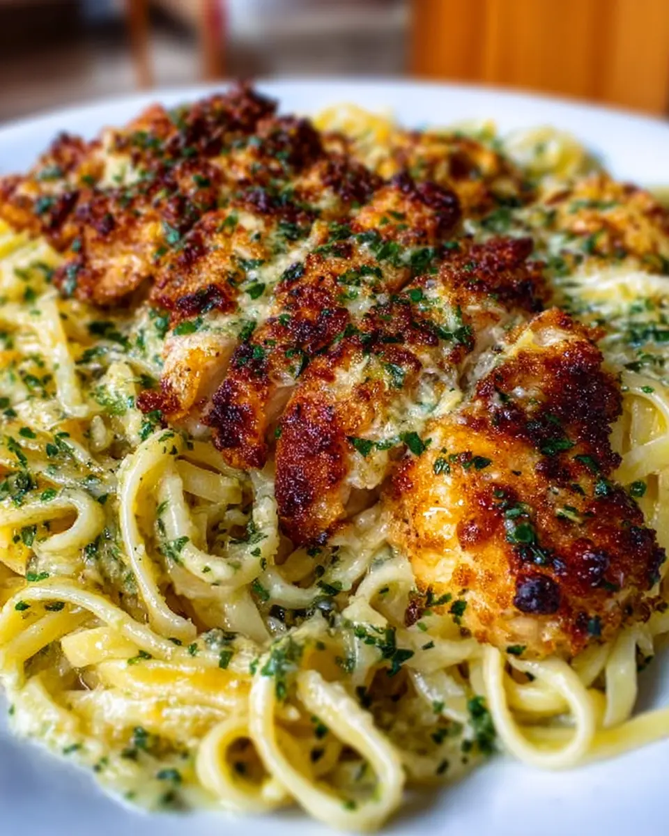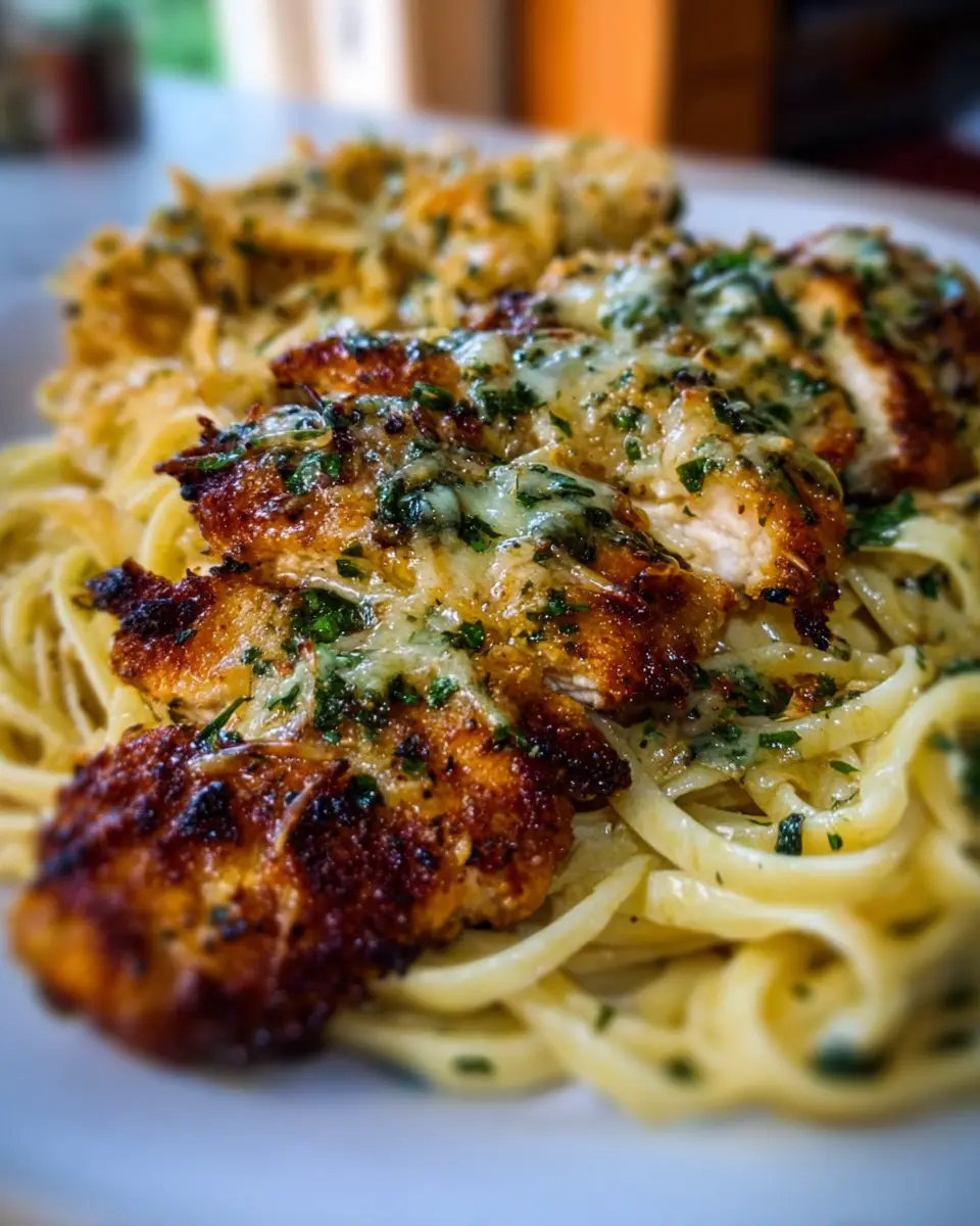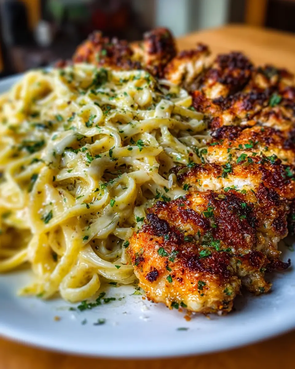 Crispy Garlic Parmesan Chicken with Creamy Asiago Linguine