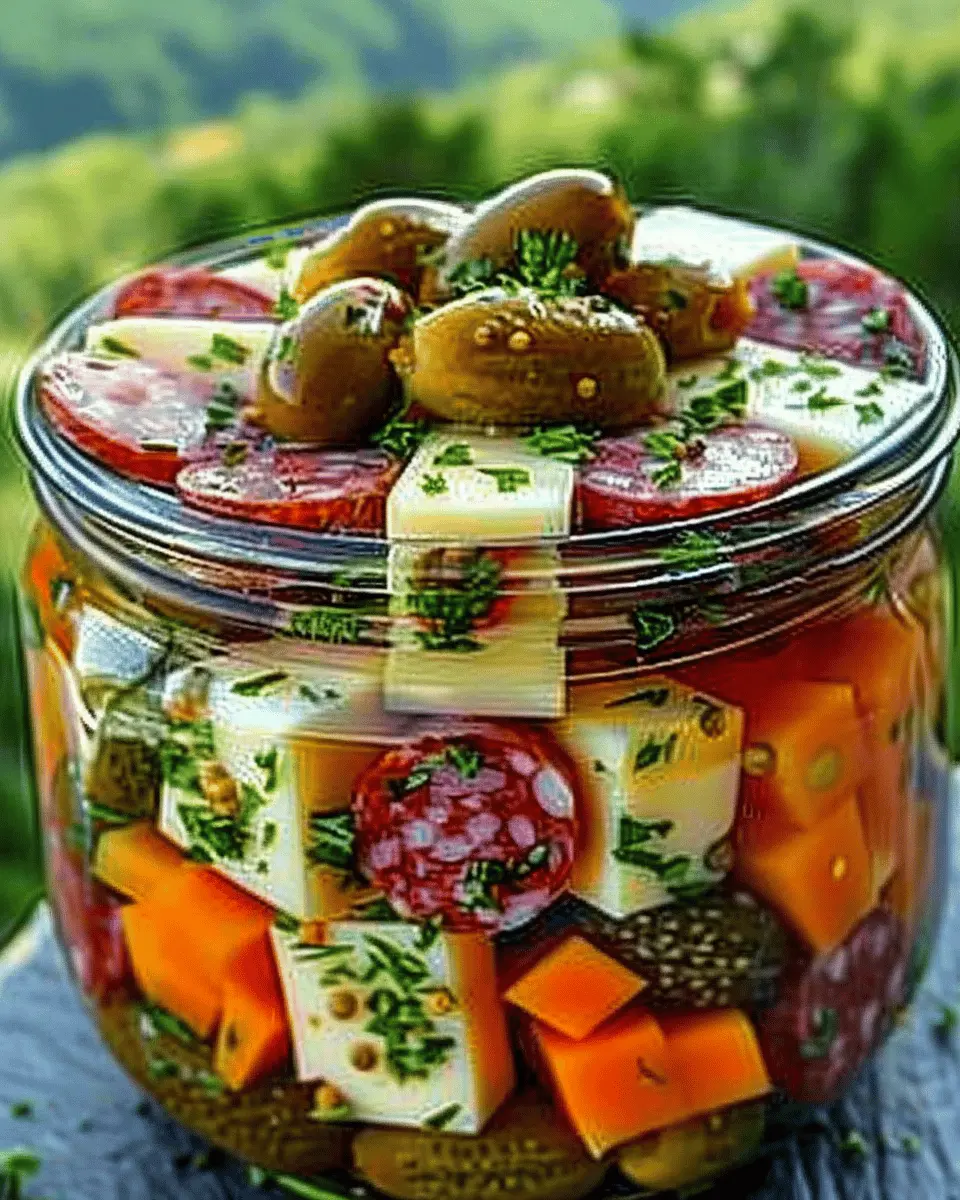 Enjoy a delightful and easy-to-make marinated cheese appetizer perfect for gatherings, featuring salami and pickles.