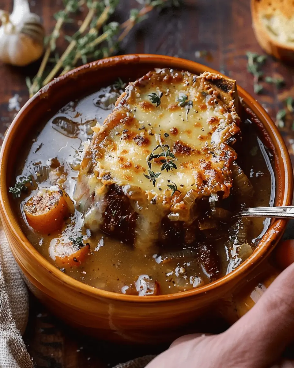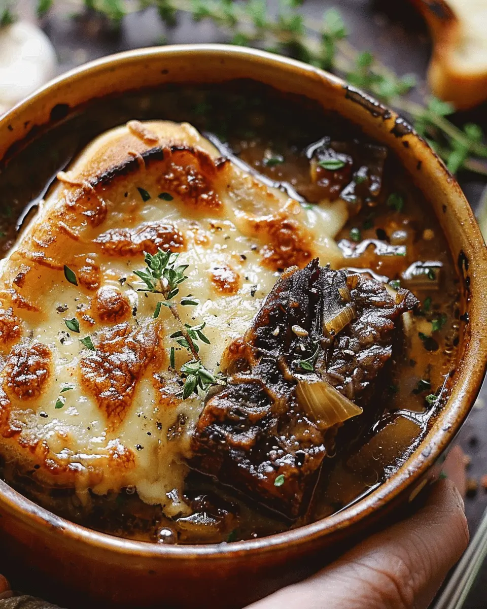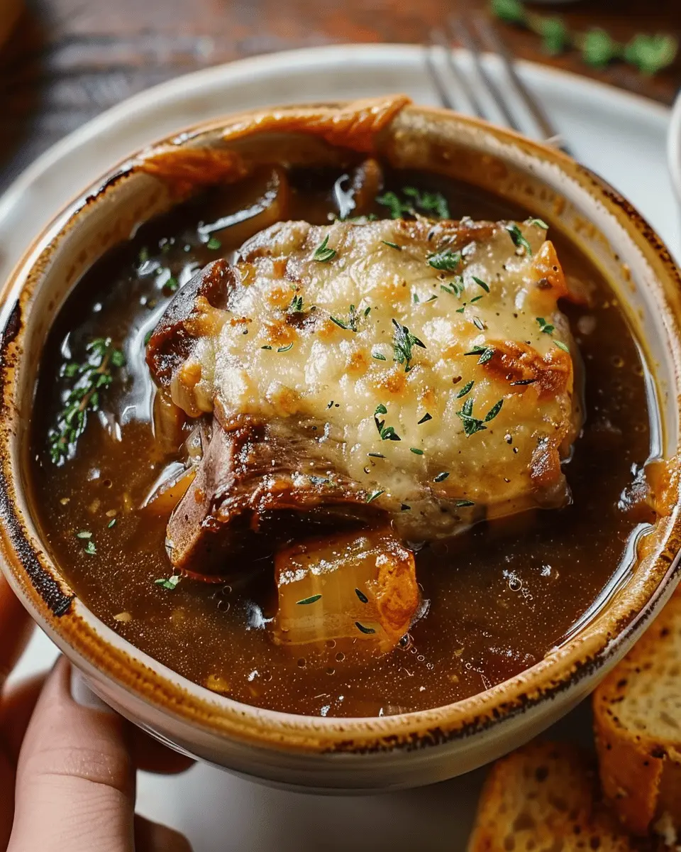 A rich and savory soup featuring tender short ribs and sweet caramelized onions, perfect for cold evenings.