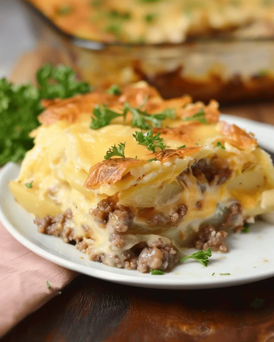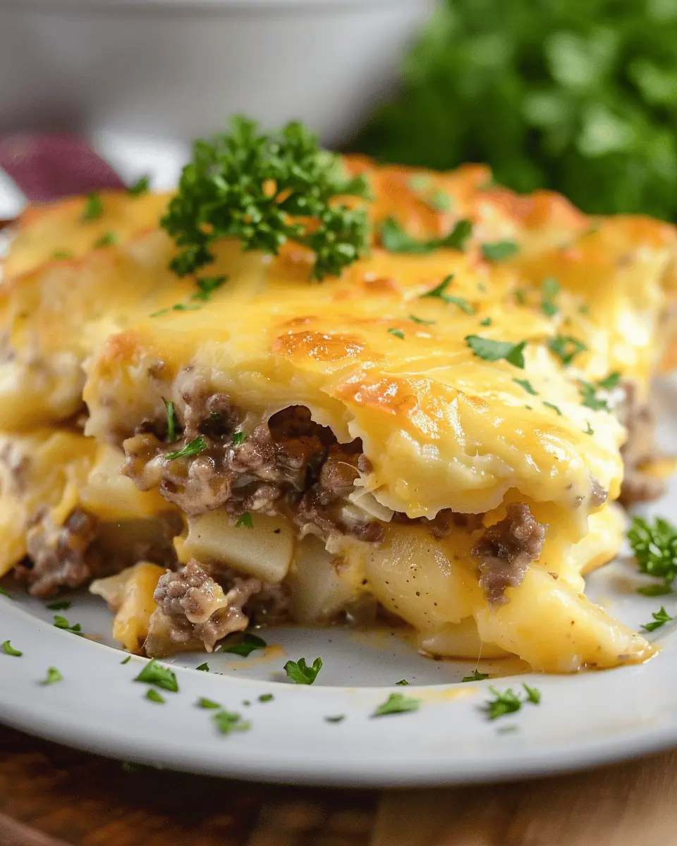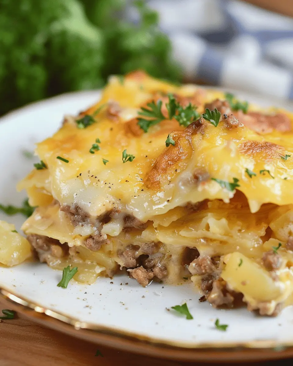 Comfort food at its finest, this Hamburger Potato and Cheese Casserole combines ground beef, creamy cheese, and tender potatoes for a hearty meal.