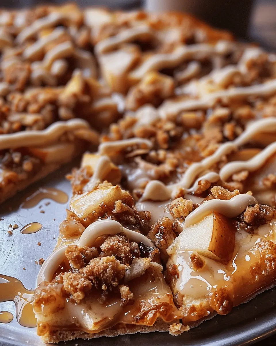 For the best experience, serve your Heavenly Apple Crisp Pizza warm, as the crisp edges and soft apple filling create a mouthwatering sensation. Not sure how to present it? Slice it into squares and place on a rustic wooden platter for a homely feel.