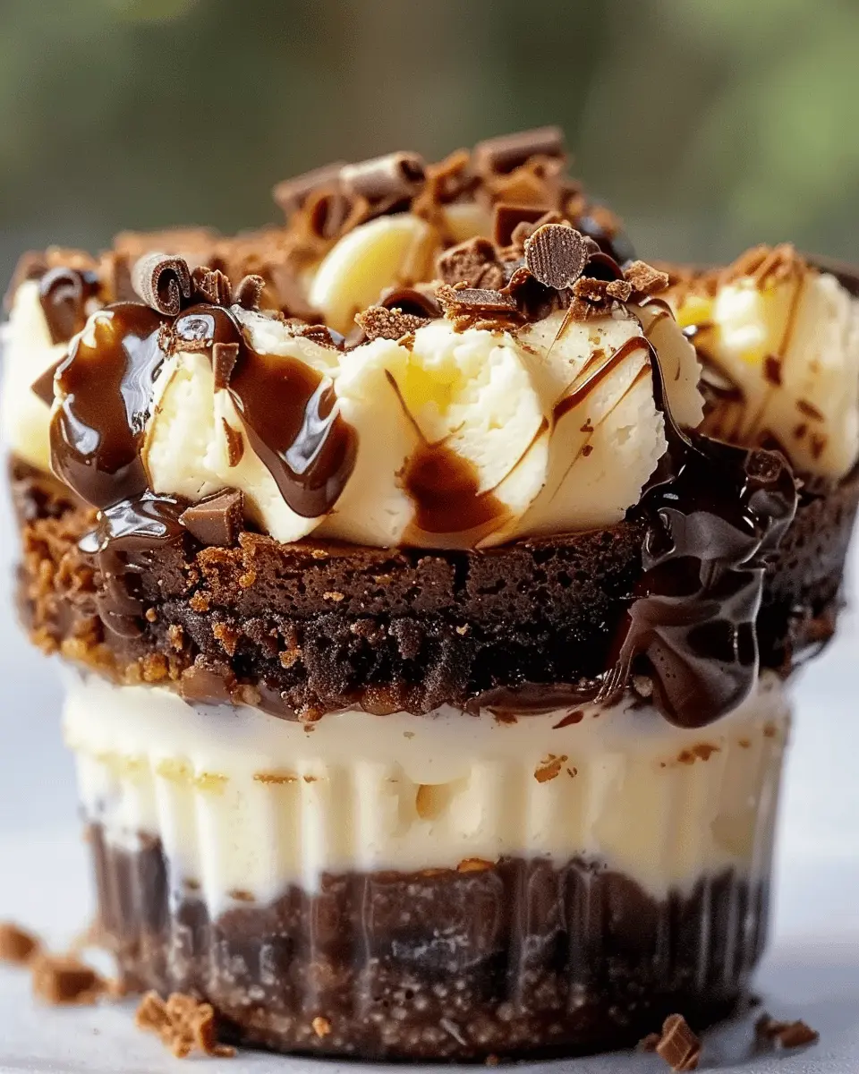 A rich and indulgent dessert that combines the flavors of brownie and cheesecake in a single delicious cup.