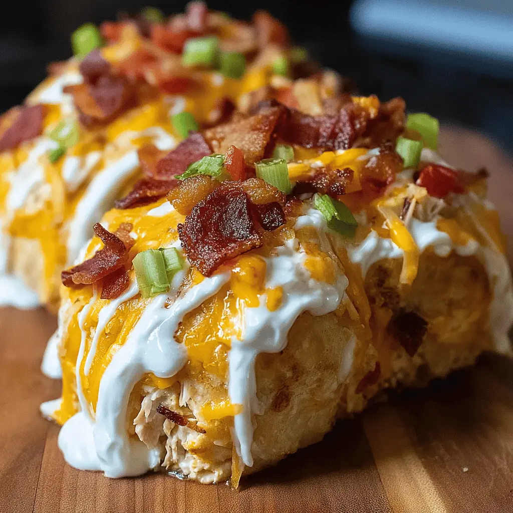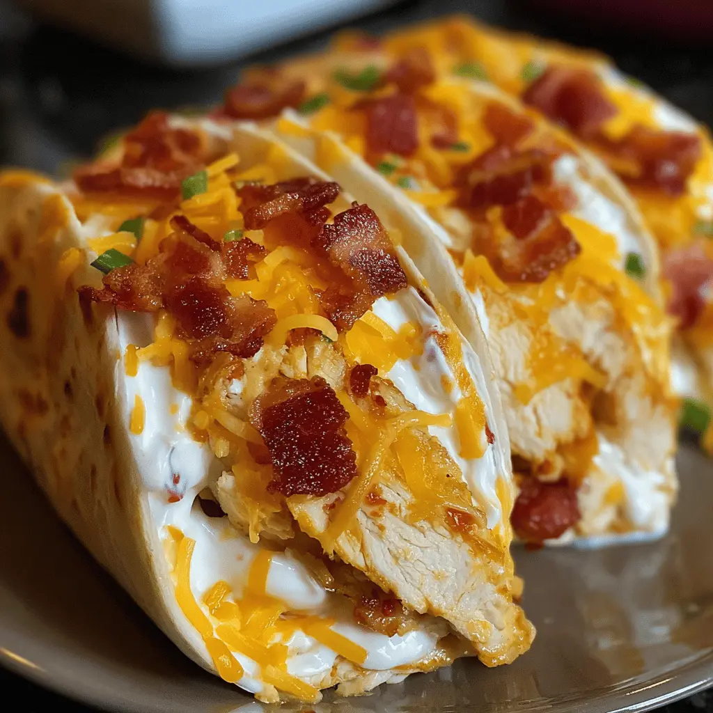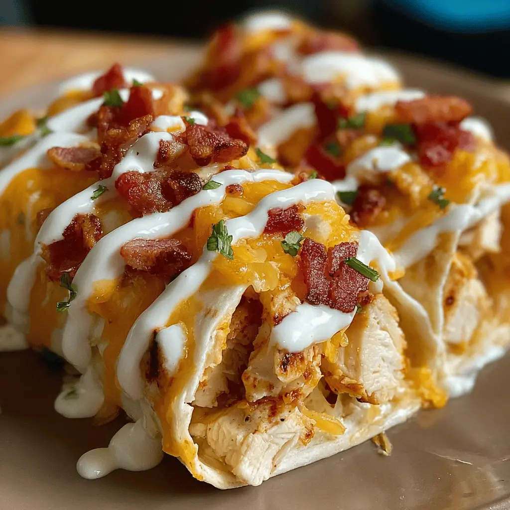 Deliciously indulgent tacos featuring loaded chicken, turkey bacon, and ranch sauce, perfect for a satisfying meal.