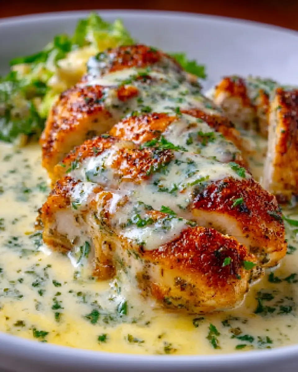 Indulge in the rich flavors of Oven-Baked Caesar Chicken with a creamy Dijon Parmesan sauce that elevates the classic dish to new heights.