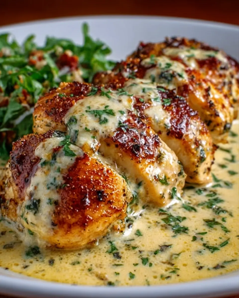 Now it’s time to bring everything together. Place your seasoned chicken pieces into the baking dish and slather them generously with your creamy sauce. Don’t hold back! If you wish, sprinkle a little extra Parmesan on top for that golden finish. Pop your baking dish into the oven and bake for 25-30 minutes or until the chicken reaches an internal temperature of 165°F (74°C).