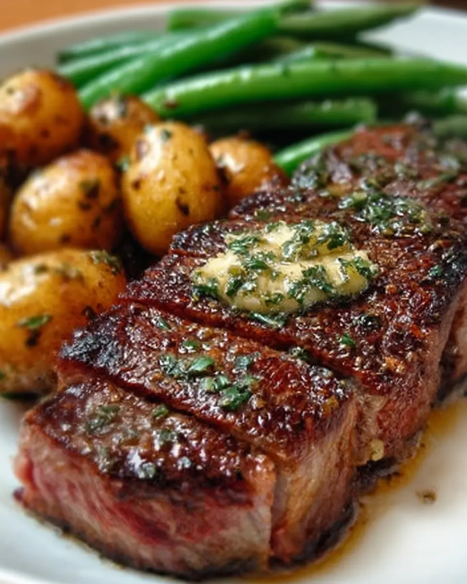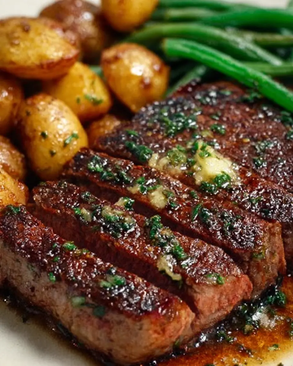 Delicious pan-seared steak with a rich garlic butter sauce, served alongside herb-infused potatoes and green beans for a complete meal.
