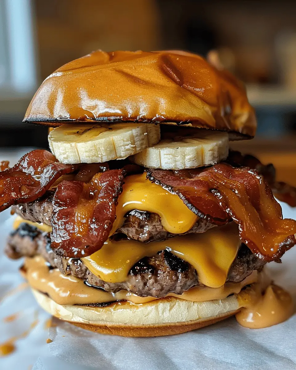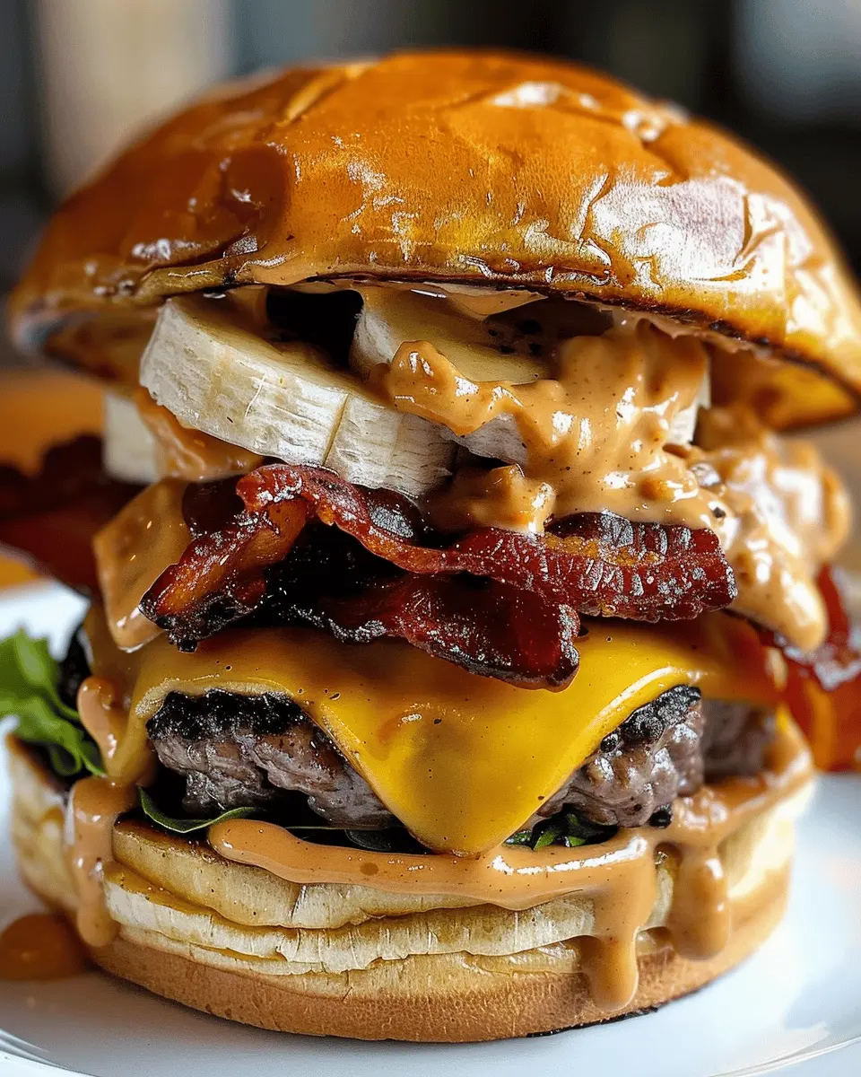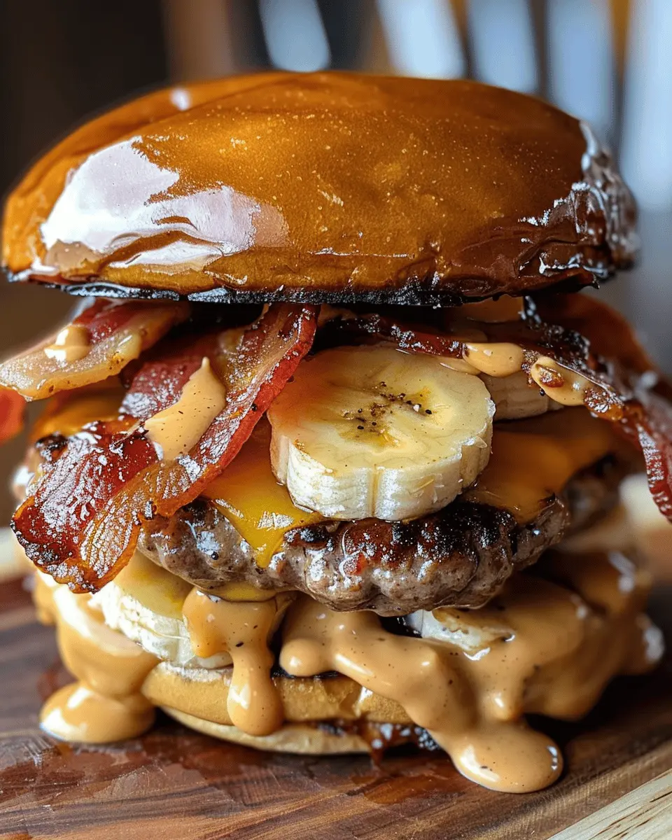 A unique twist on the classic burger combining peanut butter, banana, and turkey bacon for an unforgettable flavor experience.