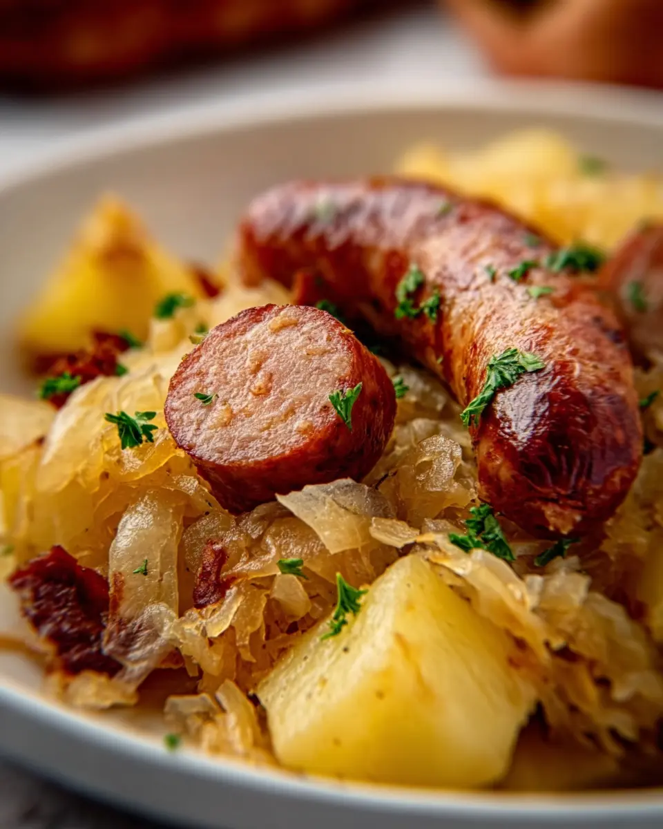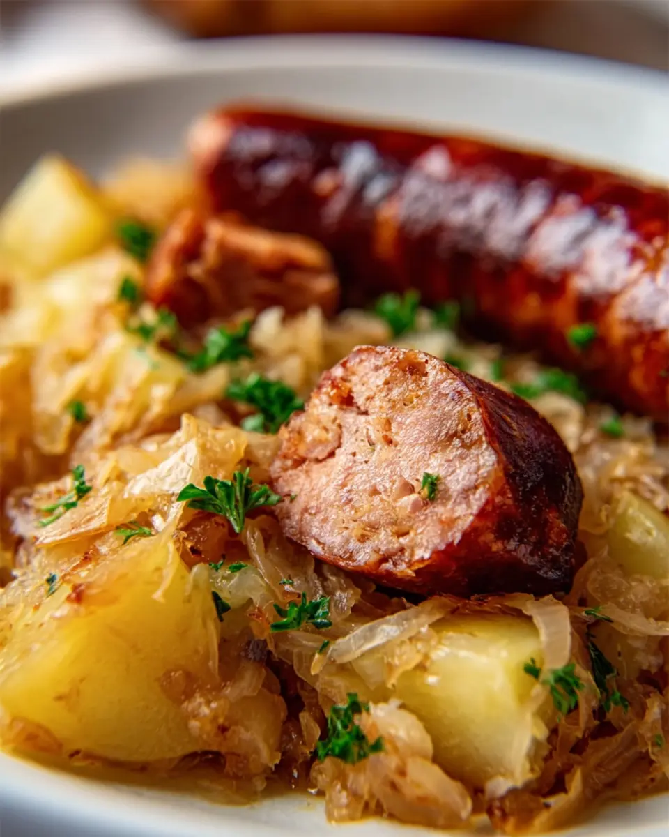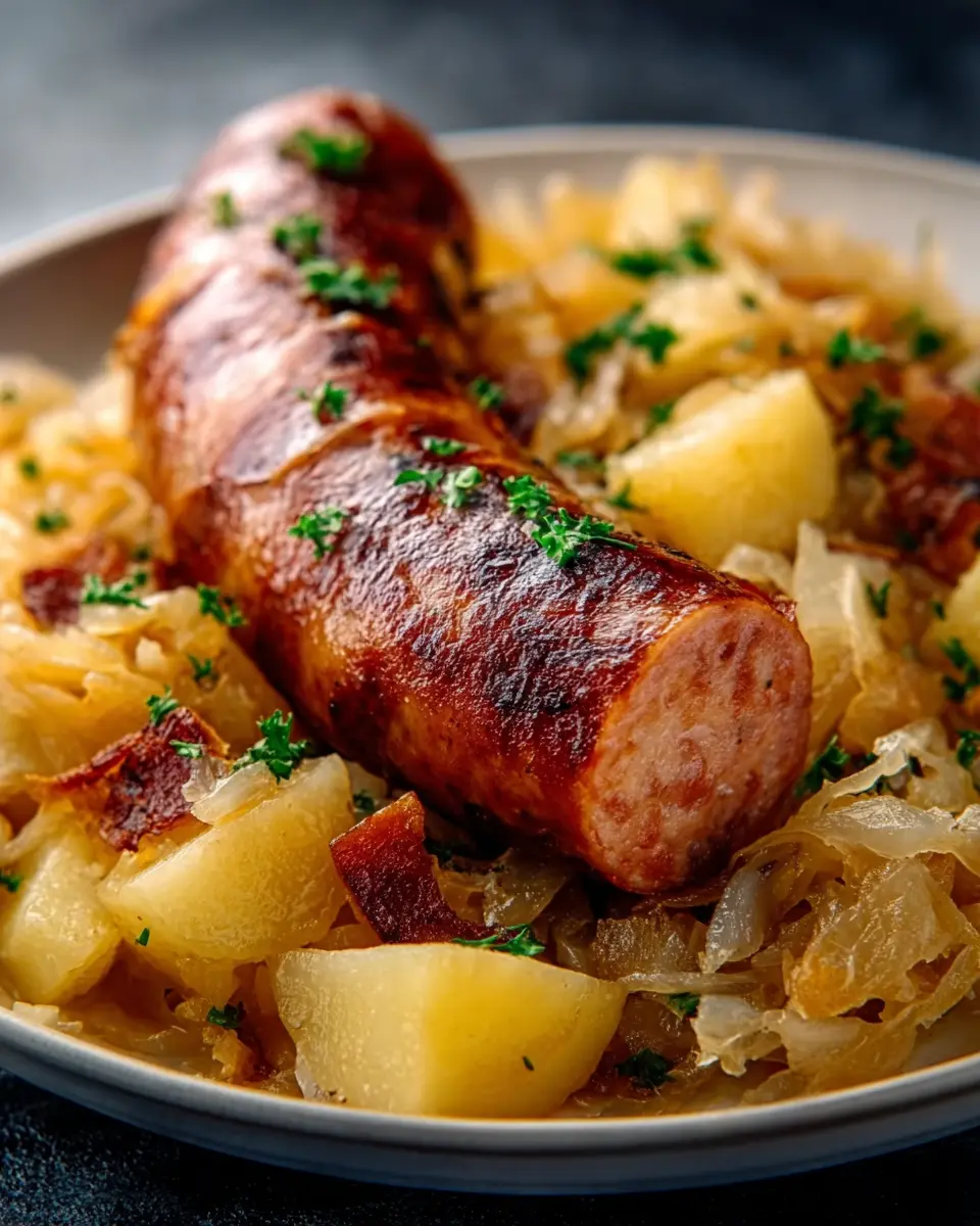 A hearty and flavorful dish combining Polish sausage, savory sauerkraut, and tender potatoes, perfect for a comforting meal.
