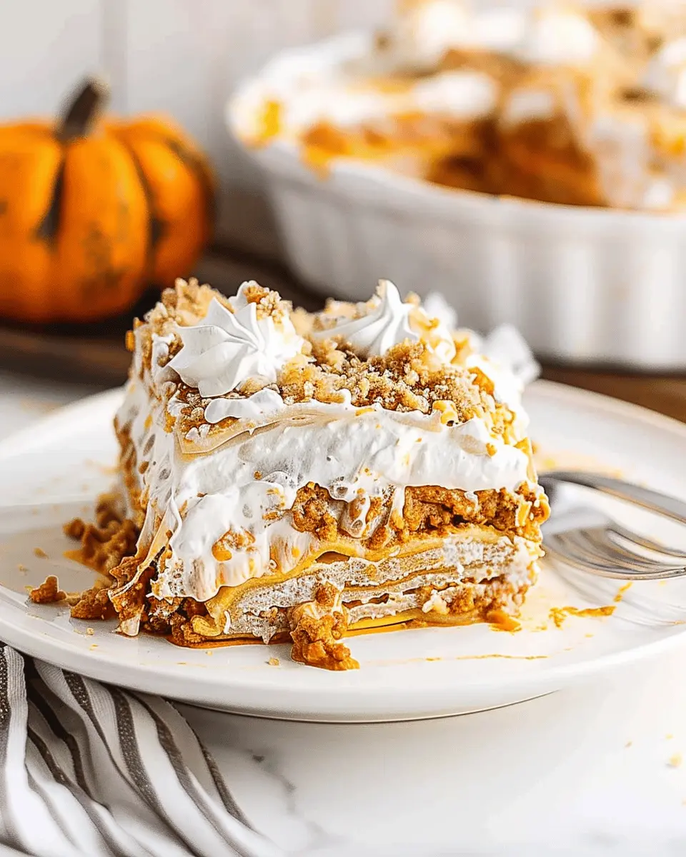 To finish off your pumpkin lasagna masterpiece, carefully spread the remaining pumpkin mousse over the last layer. For a hint of style, sprinkle some extra graham cracker crumbs or toasted nuts like pecans or walnuts on top. This will add an extra crunch and a visual flair that is both inviting and appealing.