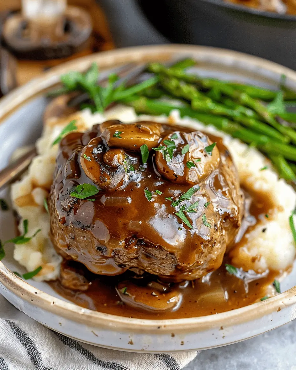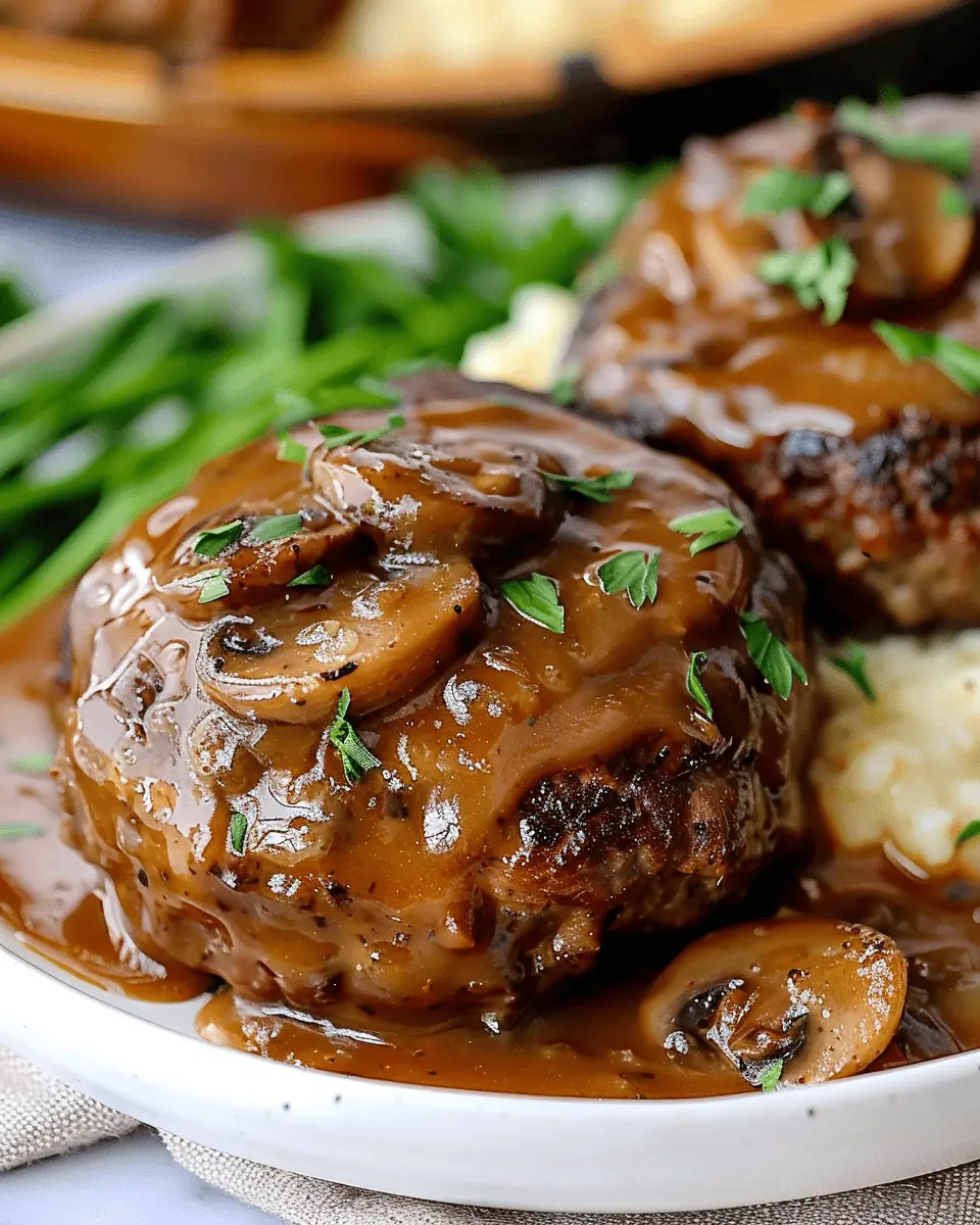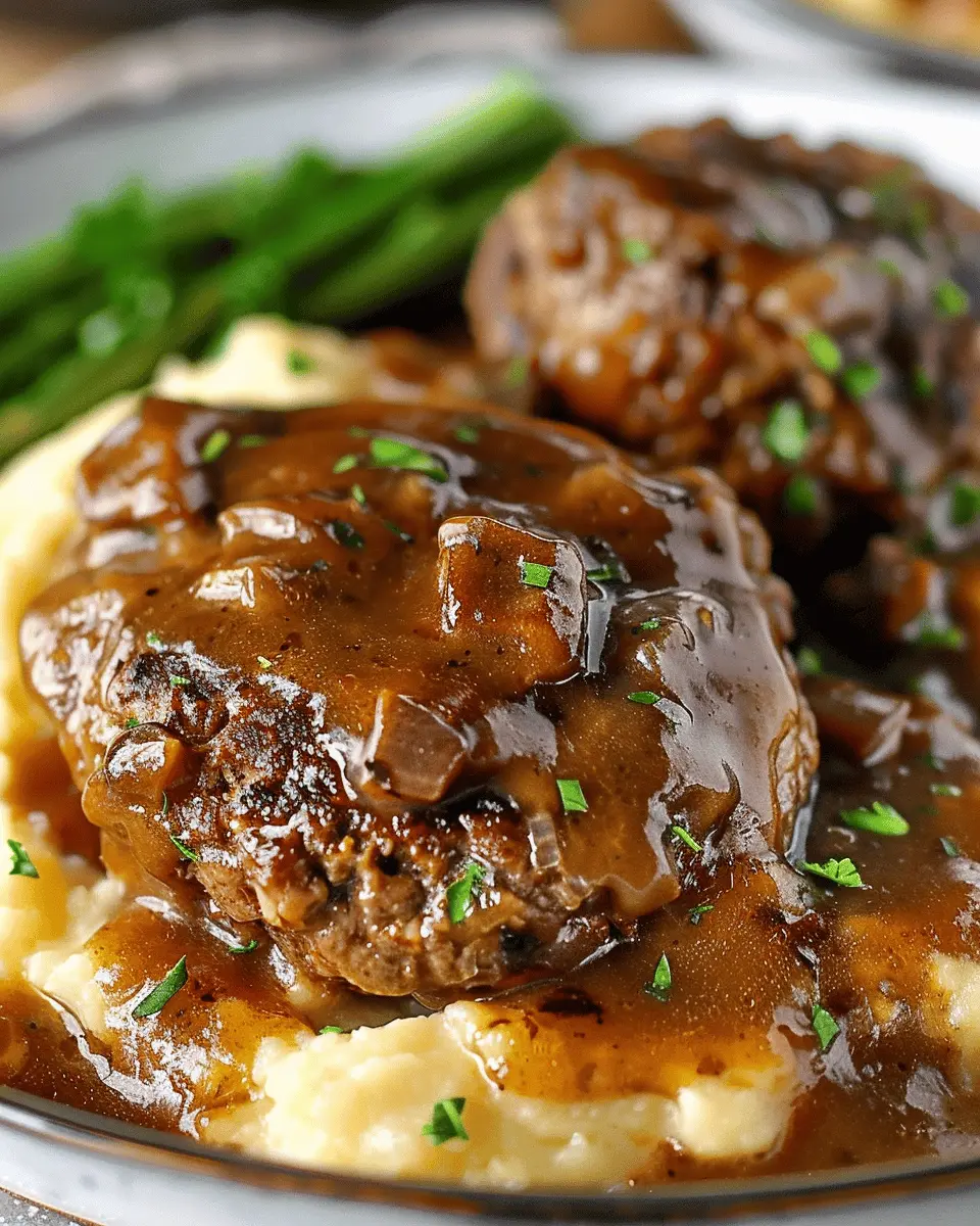 Finally, serve your Salisbury steaks warm with the luscious gravy poured over the top. This dish pairs wonderfully with mashed potatoes or fluffy rice, making for a cozy and fulfilling meal that is sure to impress at any dinner table.