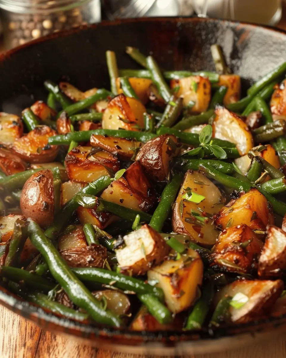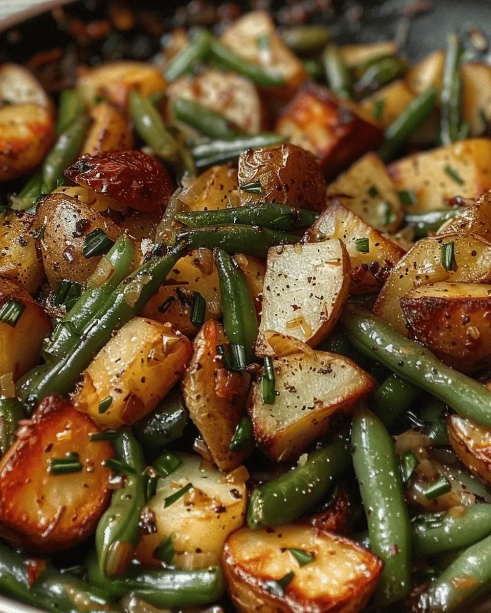 For a visually appealing presentation, arrange the sautéed potatoes and fresh green beans on a large platter, garnished with freshly chopped herbs like parsley or thyme. You can even layer them in a mason jar for a fun picnic or meal-prepping option!