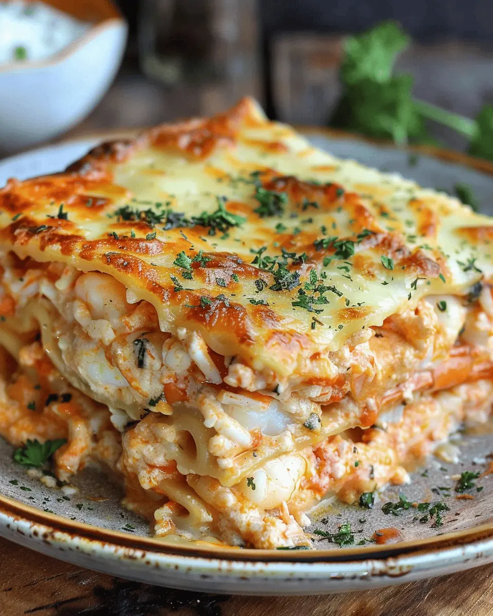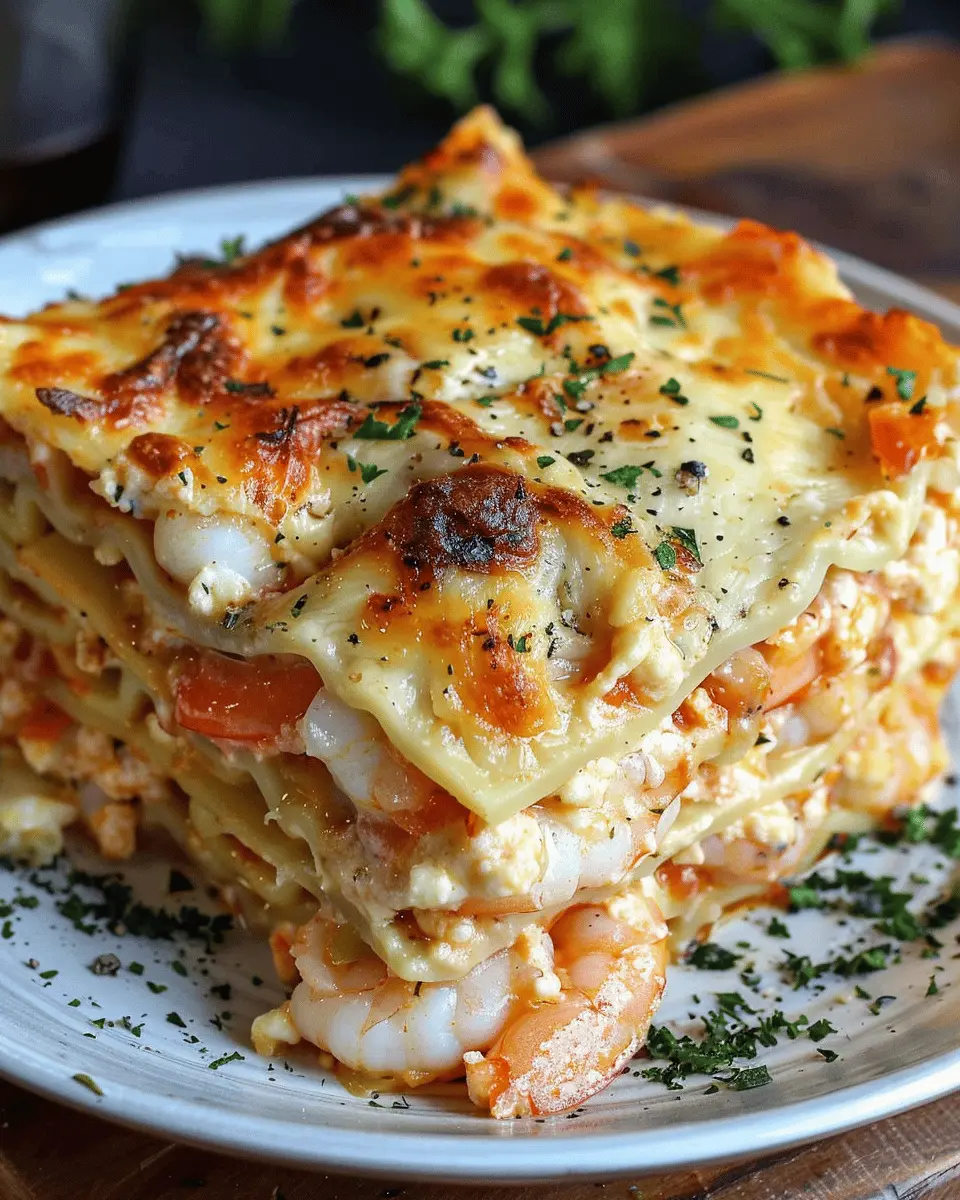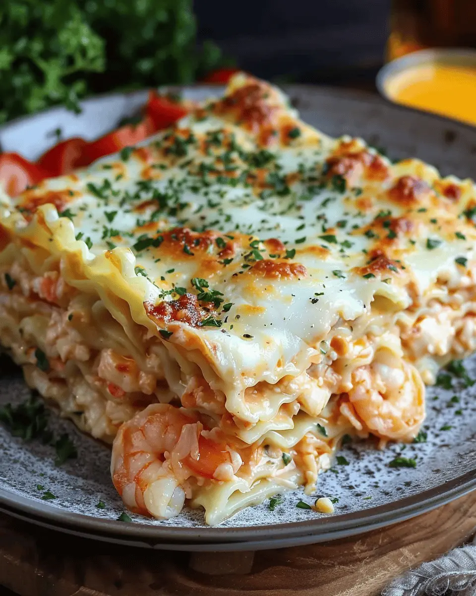 A rich and flavorful seafood lasagna featuring shrimp and crab, perfect for a comforting dinner at home.