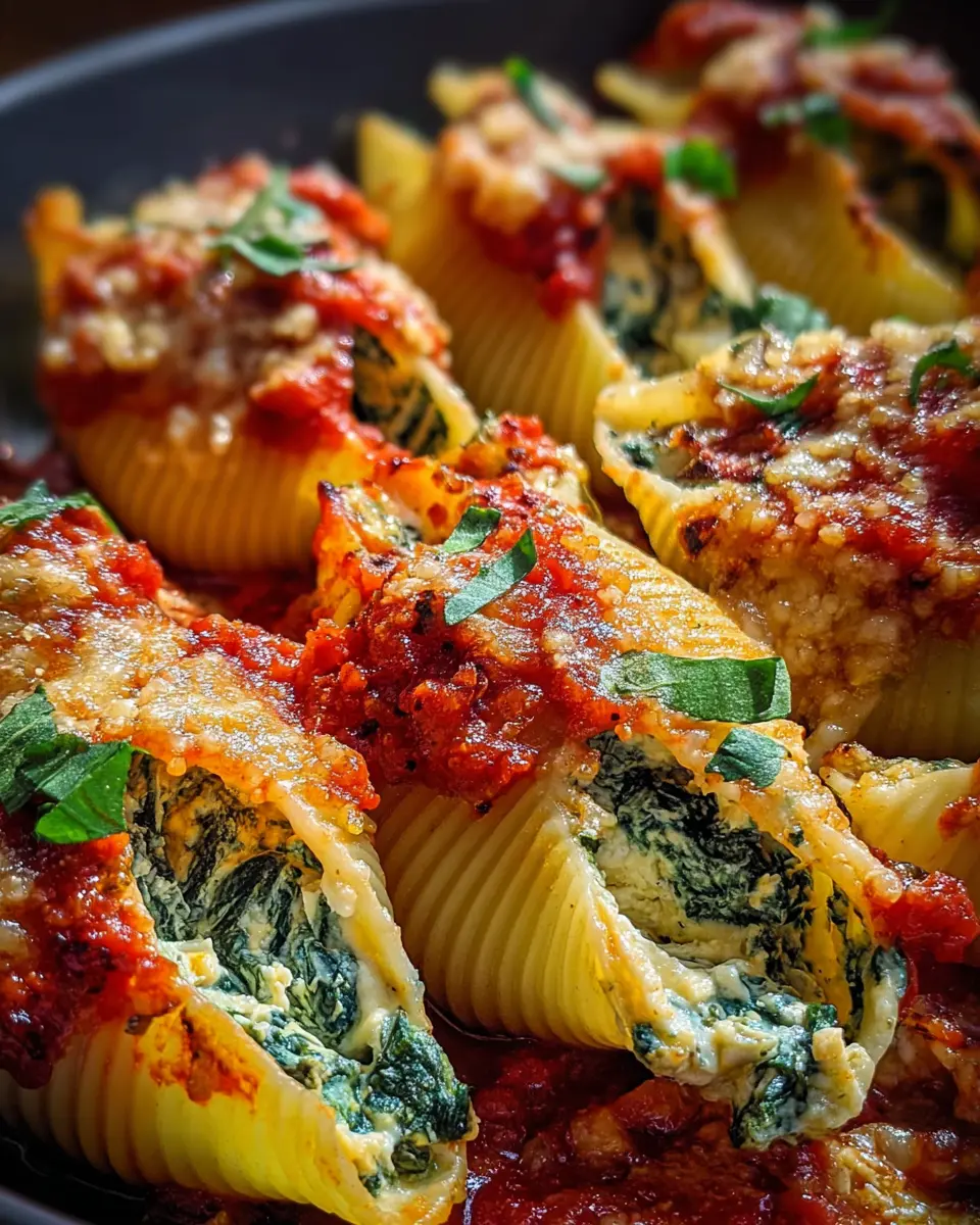 - Place the stuffed pasta shells in the dish and cover with remaining marinara sauce.