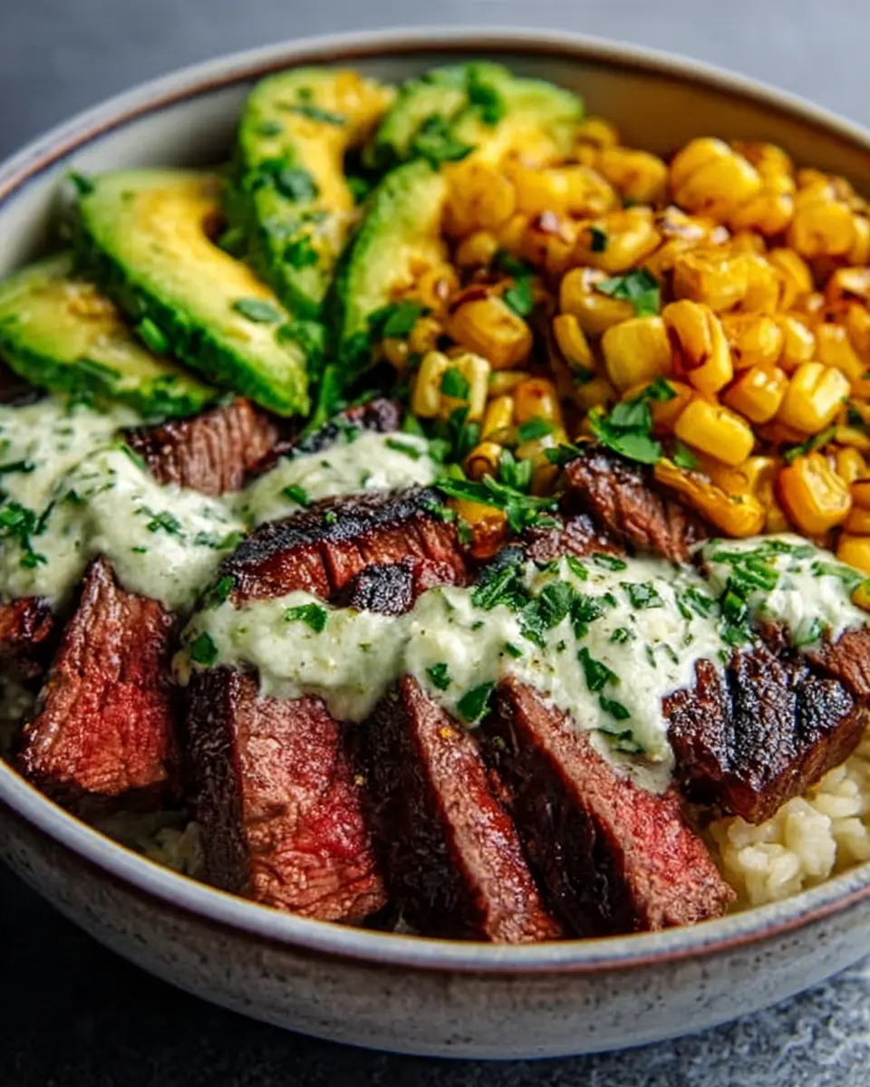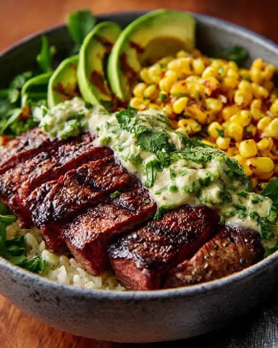 This Steak, Avocado, and Roasted Corn Bowl with Cilantro Cream Sauce is a flavorful and nutritious meal perfect for any occasion.