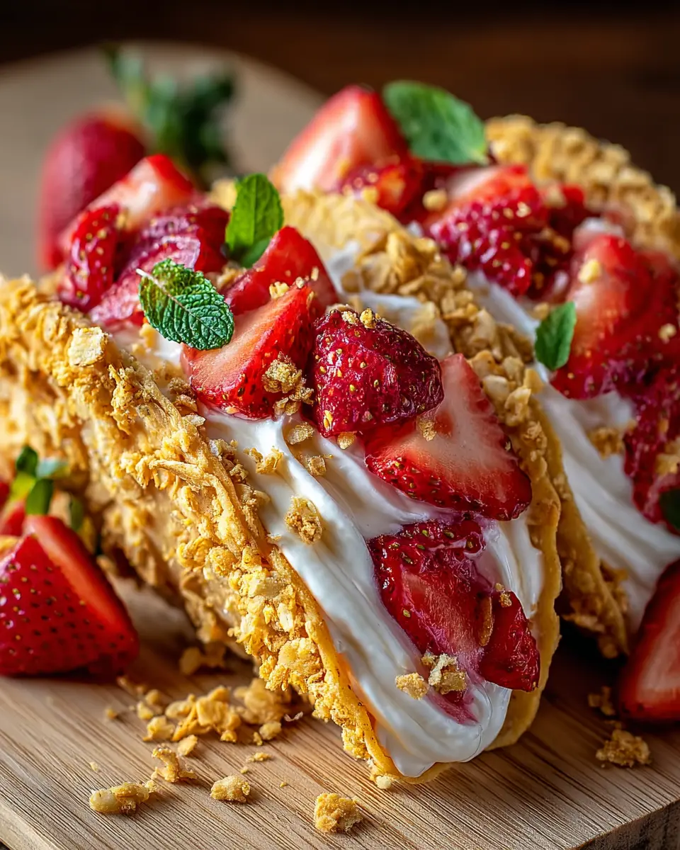 Imagine biting into a crispy taco shell filled with a smooth, rich cheesecake filling, then topped with fresh strawberries and a crunchy topping that adds a satisfying texture. Sounds tempting, right? Here are some reasons to consider whipping up this dessert masterpiece: