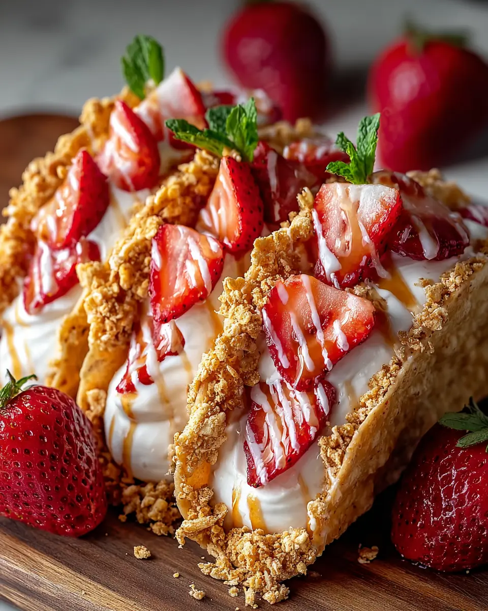 Absolutely! Strawberry Crunch Cheesecake Tacos are perfect for prepping ahead of time. You can assemble the cheesecake filling and keep it in the fridge for up to three days. Just fill the taco shells right before serving to keep them from getting soggy. If you’re making the strawberry crunch topping, it can also be prepped in advance. Store it in an airtight container, and sprinkle it on just before serving for that fresh, delightful crunch.
